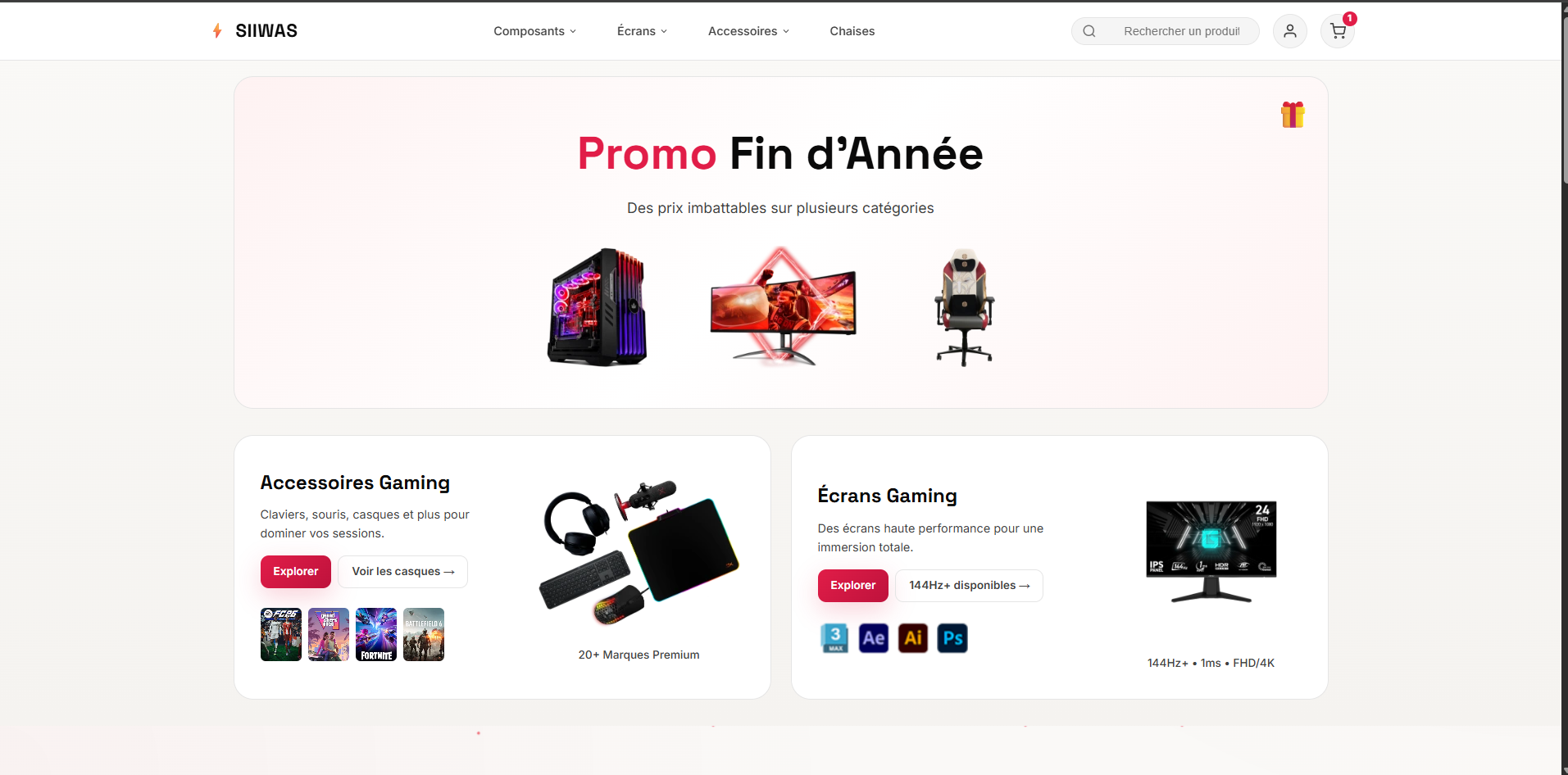Gaming e-commerce platform featuring PC components, monitors, gaming accessories with promotions and premium brands